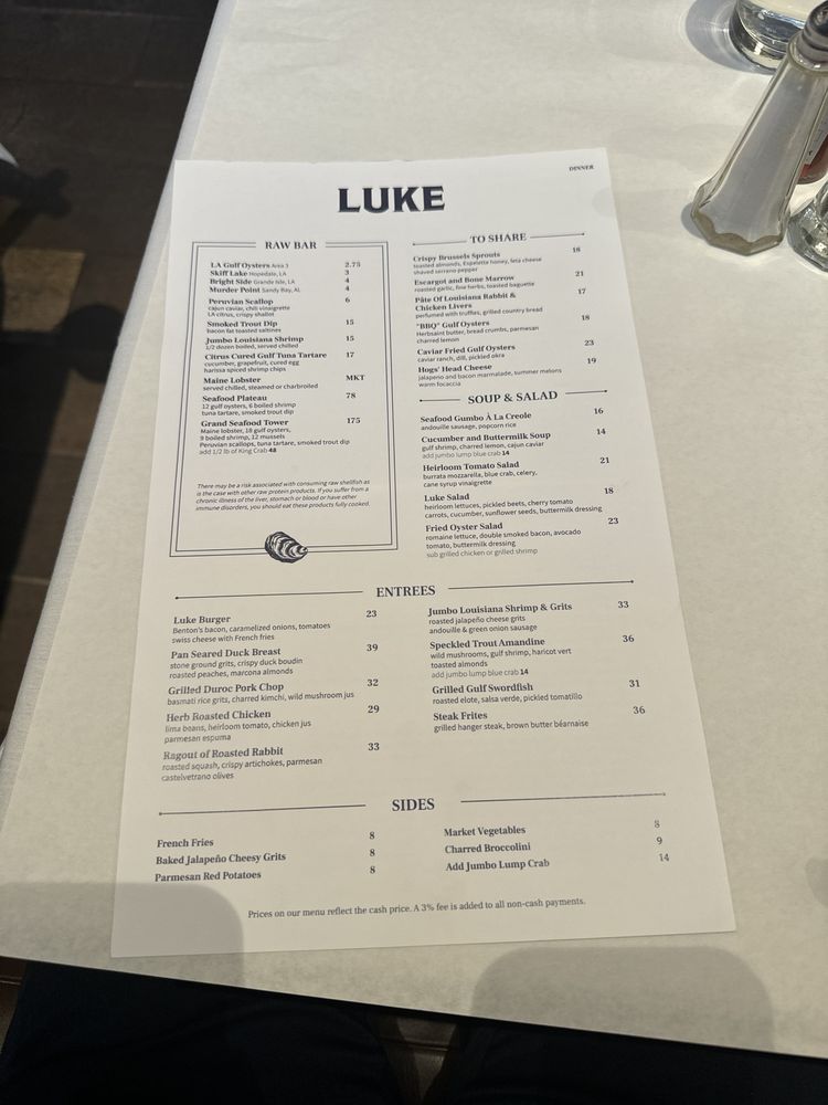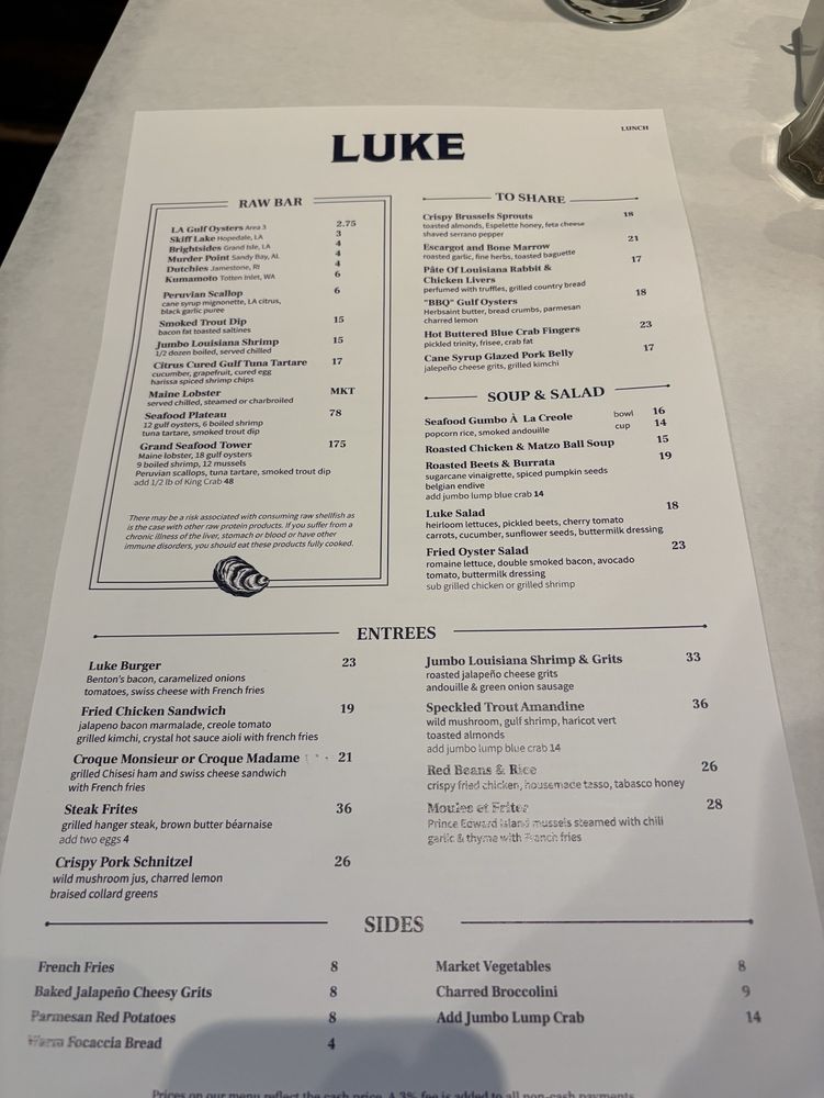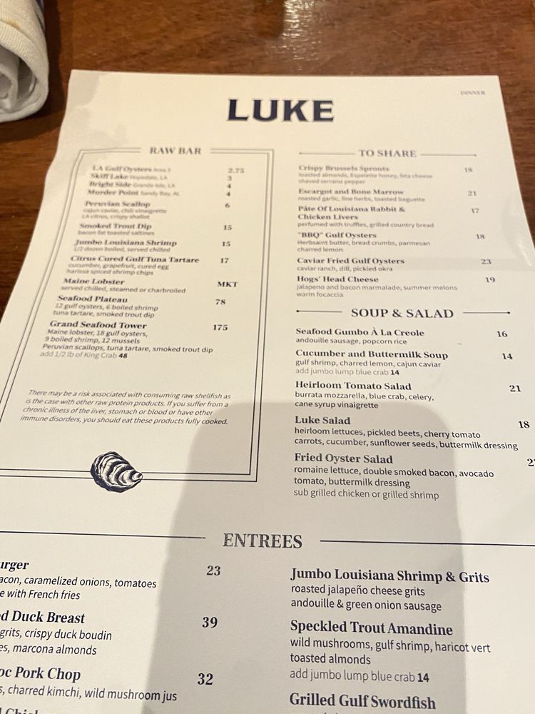 Luke is a French-German-Cajun/Creole restaurant located in New Orleans, offering a variety of dishes with a focus on fresh seafood. The menu includes dishes like the Pâté of Louisiana Rabbit & Chicken Livers and the Fried Oyster Salad, which have received high praise from customers. The atmosphere at Luke is described as elegant yet comfortable, with a daily happy hour and a wide selection of spirits. The service is outstanding, with attentive staff members like Joe making the dining experience memorable. Cocktails are well-balanced and delicious, while the food is described as to die for. The restaurant's happy hour deals are also highlighted as unbeatable. Overall, Luke offers a unique dining experience with a blend of old-school charm and fine dining, making it a must-visit spot in New Orleans.